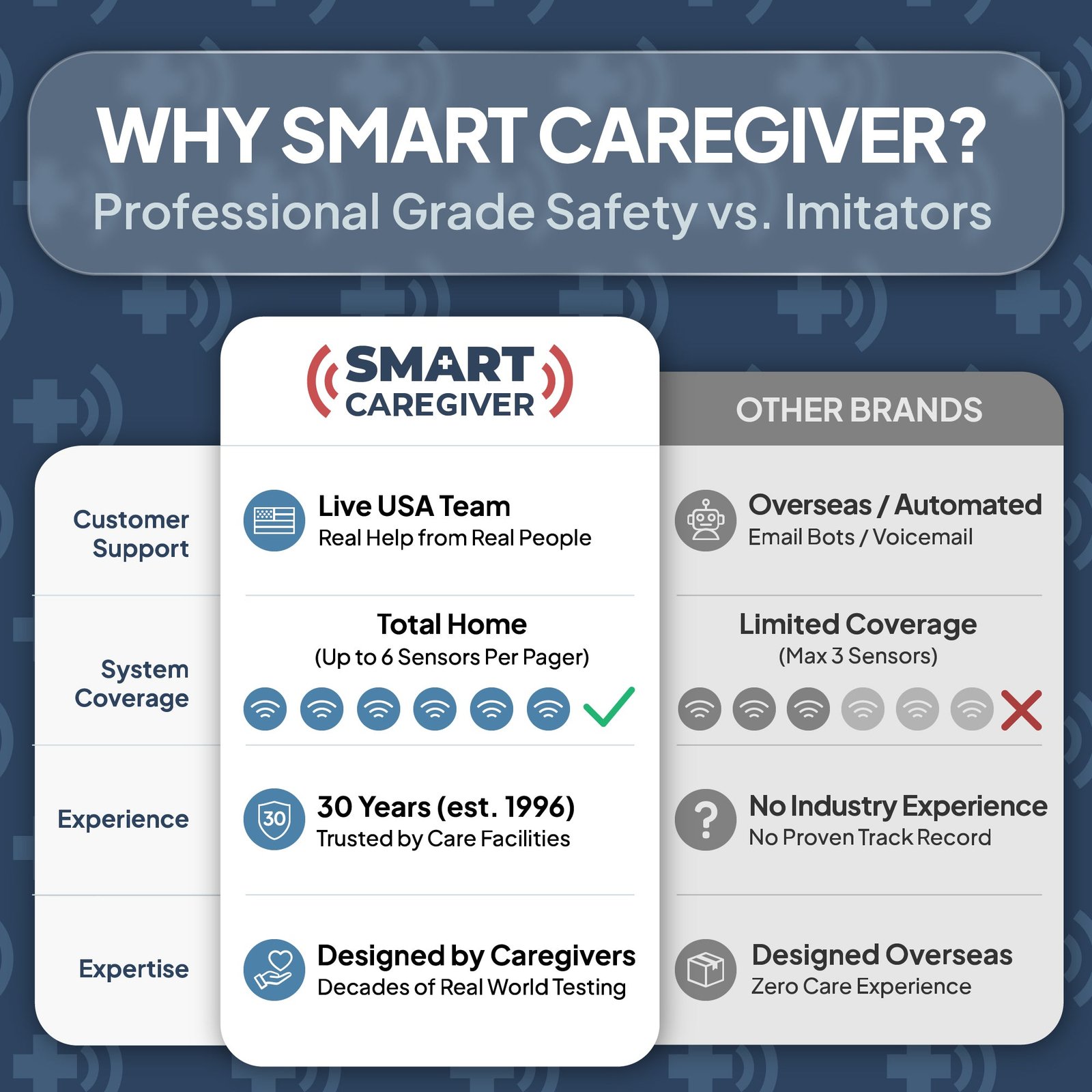 Caregivers can regain peace of mind day and night by knowing when your loved one is safe in bed.  The Smart Caregiver bed alarm automatically lets you know when the person that you’re caring for starts to get up from bed. The caregiver pager pairs with our wireless pressure-sensitive bed pad, providing reliable alerts when your loved one begins to get out of bed, so you can provide aid before a fall occurs.