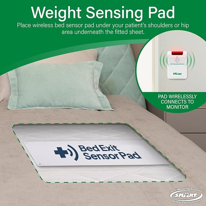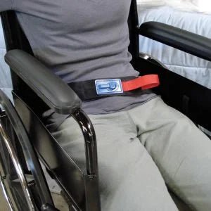 This can be used on a chair or a wheelchair. Cord clips from residents clothing to a clip on the monitor. When resident attempts to get up, it pulls the clips apart and sets off the alert.